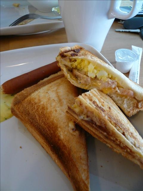 另一份是目覺朝食158元 三角麵包內餡是燻雞起司
