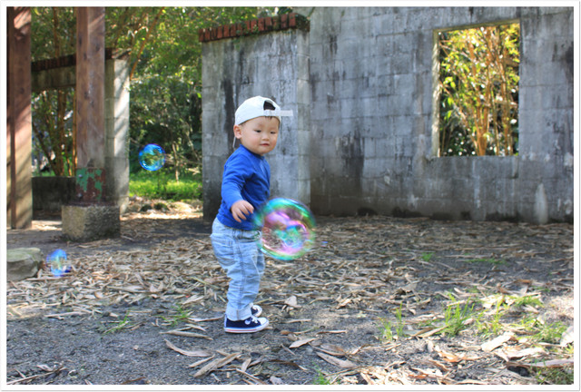 把拔買了一款大型的吹泡泡機,找個人少比較空曠的地方,和小威一起同樂