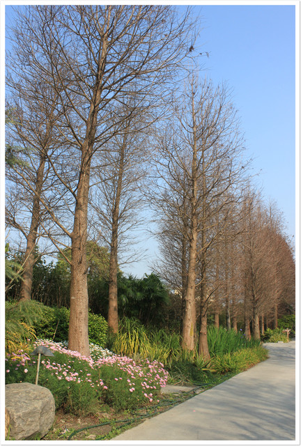 雖然葉片早以掉光,看不到翠綠茂密的落羽松,不過成排的枯樹看來多了一分蕭瑟,彷彿置身於北國當中!!