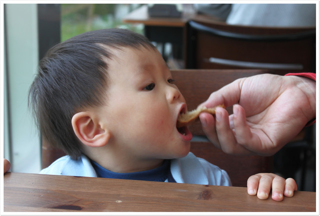 小威也很喜歡吃土司,一口接一口,水果茶他就不愛了,白開水還是他的最愛^^