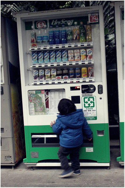貪吃鬼的小威,看到一旁的販賣機,就拋下老媽和推車,一台一台巡視,看看有沒有中意的