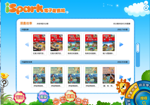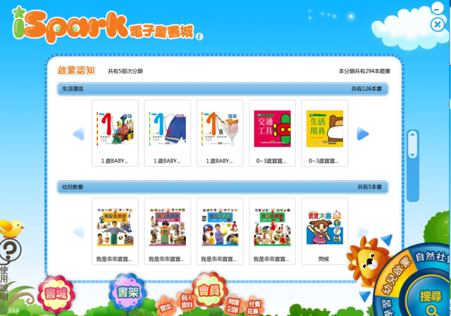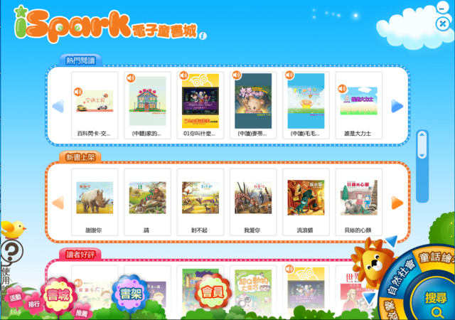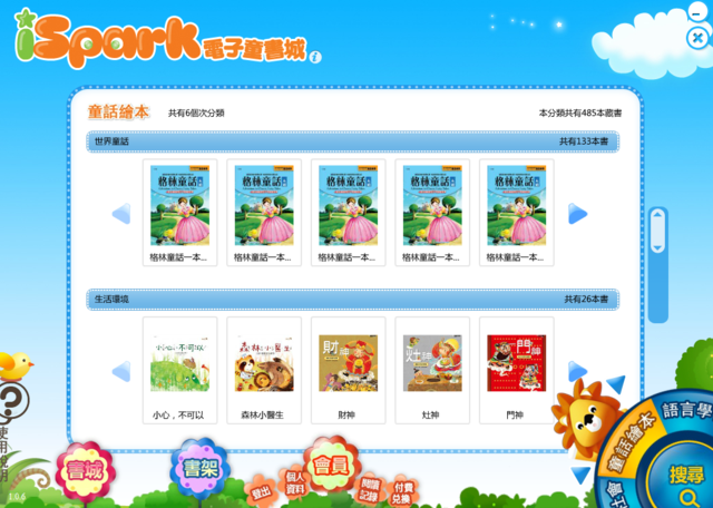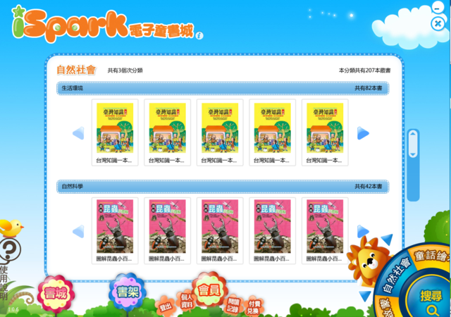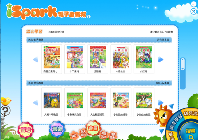 iSpark電子童書城所提供的書籍,種類包括自然社會、童話繪本、啟蒙認知、語言學習、漫畫故事,空中美語教室這裡也有提供下載