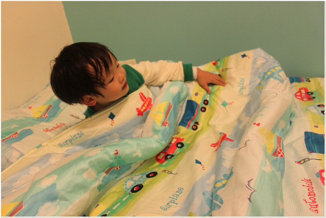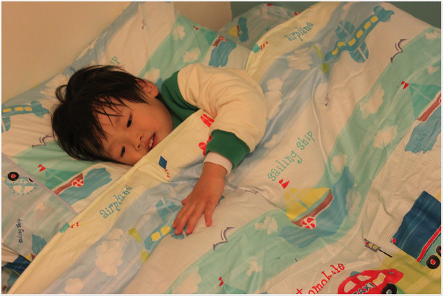 小威的睡袋也是動物園和交通樂園,中午在學校陪他睡午覺,超開心