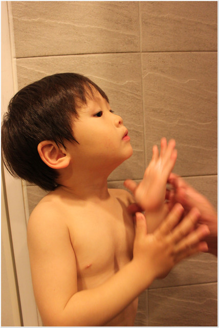 可塗抹於全身,幫小威臉上也擦了一些,冬天臉部有點乾,小朋友也逃不了,記得幫他們擦點乳液!!