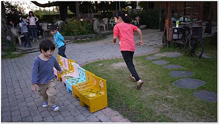 餐廳外頭還有一排可愛的彩繪小椅凳,為了製造更多的歡樂,於是玩起大風吹的遊戲
